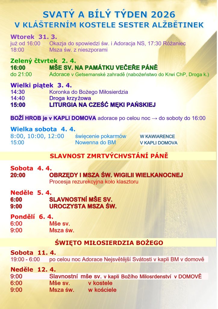 Ostatnia Droga Krzyżowa w Wielki Piątek będzie o godz. 7.00 w kościele parafilaym. Obrzędy Welkiego Piątku rozpoczynają się zarówno w kościele parafialnym jak i w kościołach filialnych o godz. 17-tej. Po nich zapraszamy na Adorację do Bożego Grobu aż do wieczornych obrzędów Wielkiej Soboty. Od Wielkiego Piątku – przed obrzędami – rozpoczynamy modlić się nowennę do Miłosierdzia Bożego.
